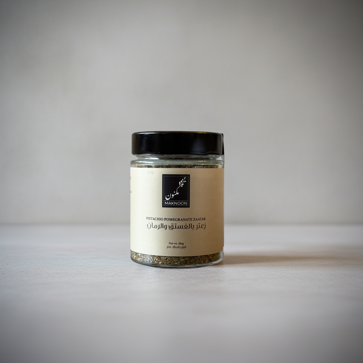 Maknoon’s Pistachio Pomegranate Zaatar is a vibrant twist on the traditional Levantine blend. Fragrant wild thyme, toasted sesame, and tangy sumac are elevated with roasted pistachios and sweet-tart pomegranate, creating a balance of brightness, crunch, and depth of flavor.